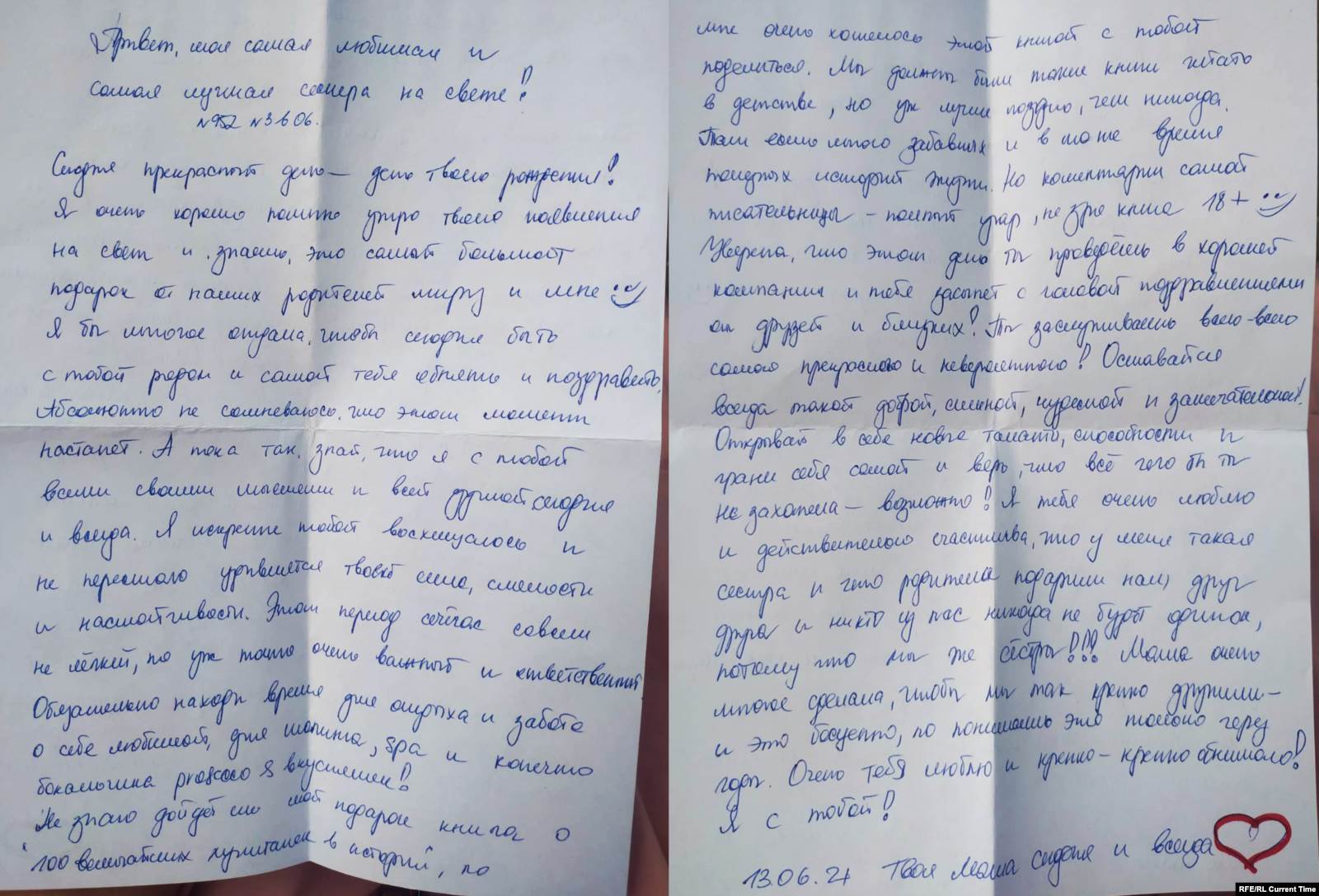 "Первое письмо от Маши пришло 22 сентября. На нем написано даже "письмо №1″, – рассказывает ее сестра Татьяна Хомич. – Она пишет: "Пиши по мере возможностей, как поживают наши ребята, как команда", – что она очень скучает и верит в них, волнуется, конечно, за родных, как они восприняли эти новости, как пережили. Это про папу, это про бабушку с дедушкой, других родных". (Бабушка Марии умерла в июне 2021 года.)