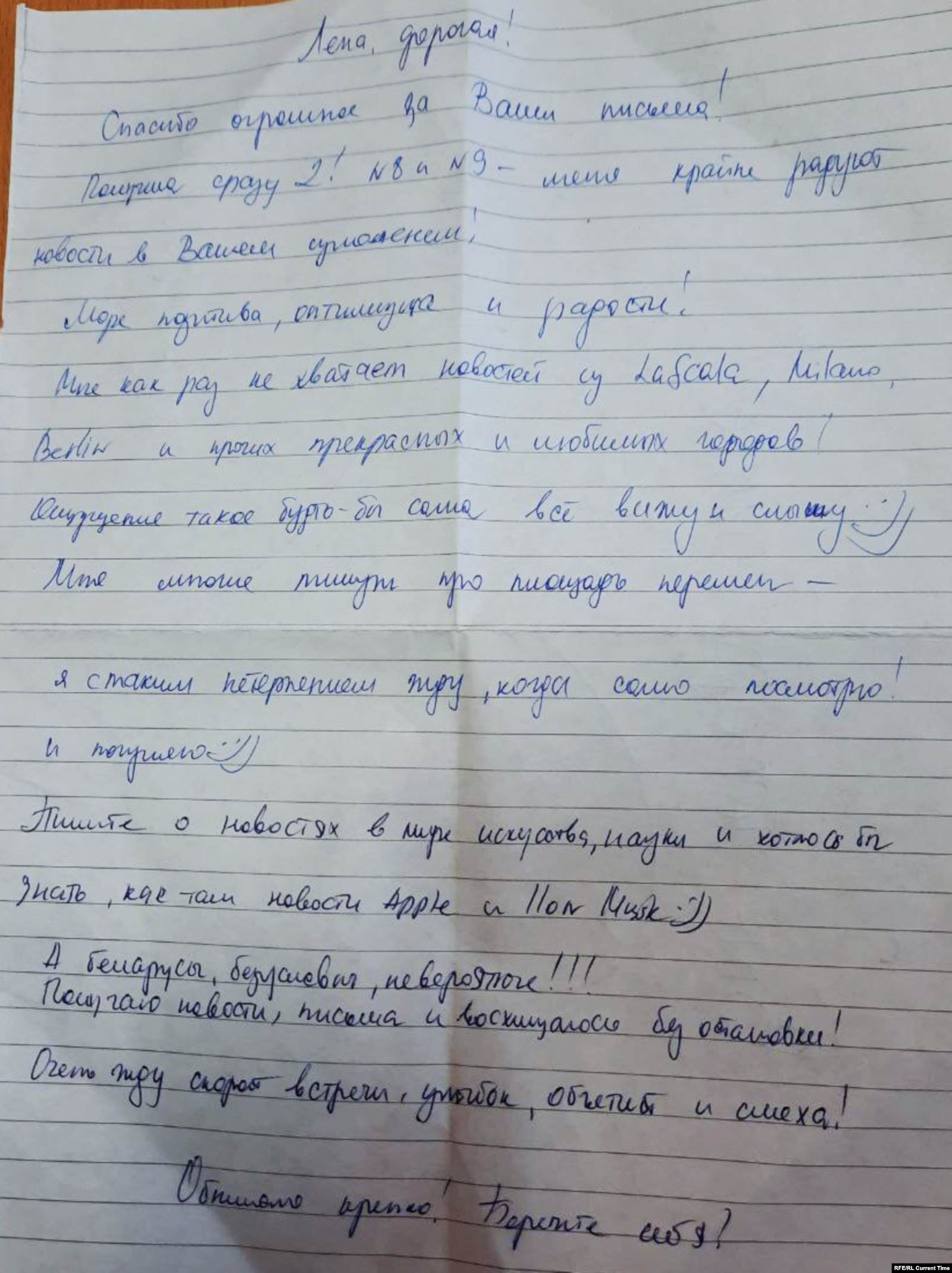 Те, кто пишет политзаключенным (а их в Беларуси сейчас более 500 человек), знают, что все письма проходят цензуру. Намеки, оценки, непонятные аббревиатуры уменьшают шансы послания попасть к адресату и могут даже навредить ему. Но сказать наверняка, какое письмо пройдет цензуру, очень сложно, говорит Татьяна Хомич: