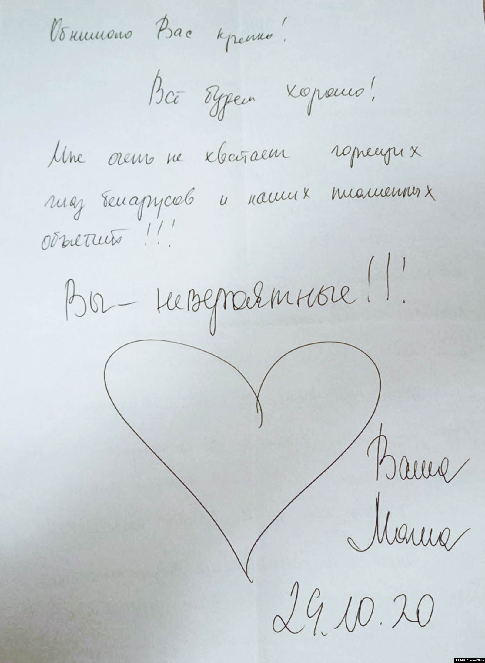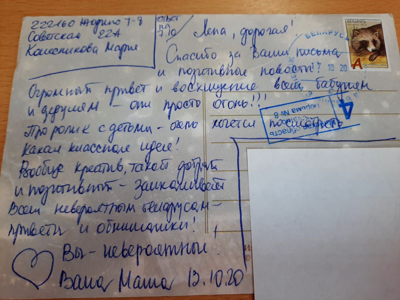Почти месяц Мария не получала никаких писем, а 9 октября ей передали сразу 400. Информация о сотнях писем, адресованных Колесниковой, моментально появилась в СМИ и блогах. Многие с восторгом рассказывали, что получили от Марии ответ. "Ее только задержали, вообще не было понятно, что с ней, в каком она настроении, состоянии, и в целом не было понятно, что происходит со всеми политзаключенными", – рассказывает Татьяна Хомич.