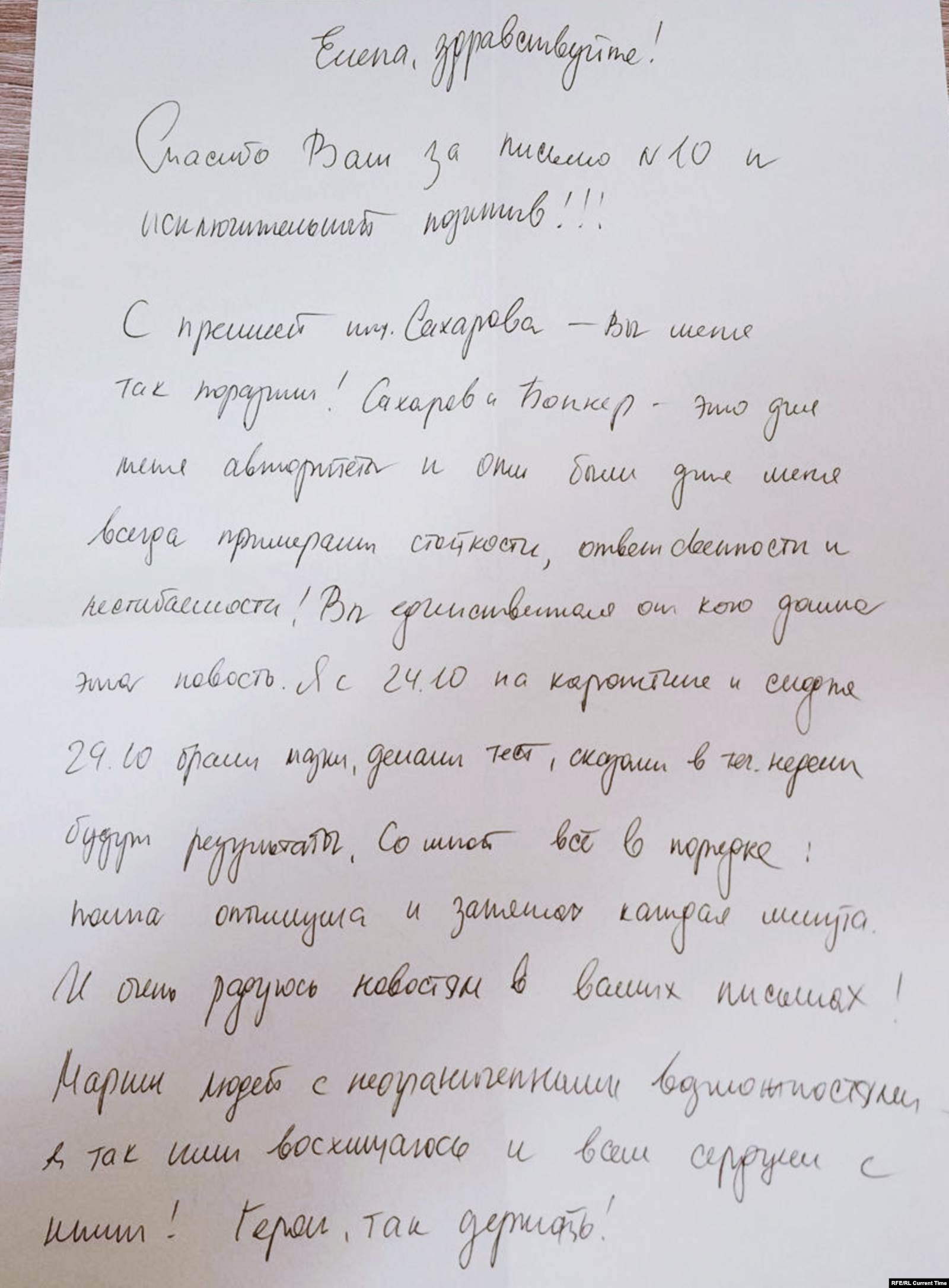 Елена лично не знакома с Марией. Но она одна из немногих, кто на протяжении всего заключения Колесниковой получает от нее ответы на свои письма.