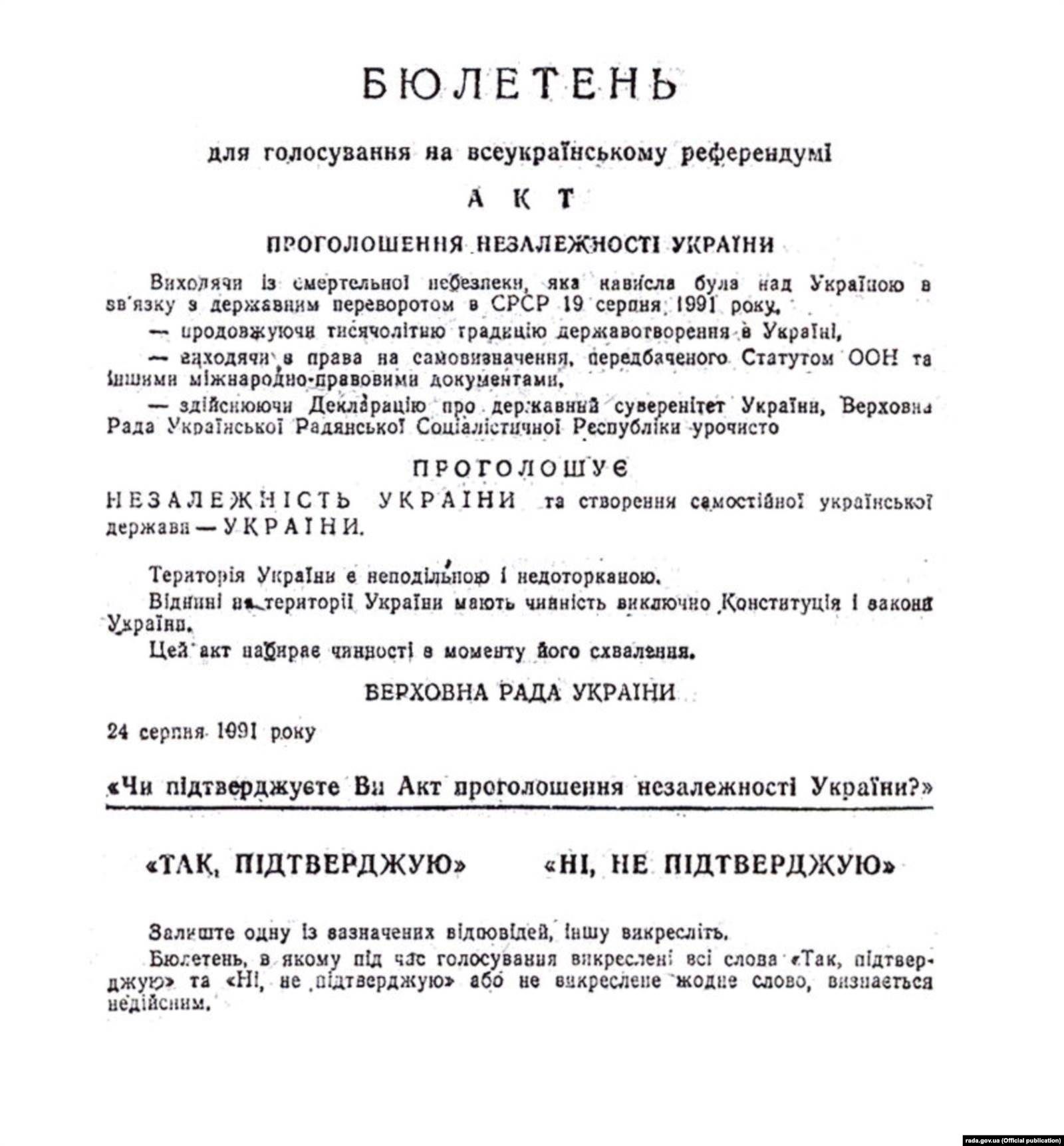 24 августа 1991 года Верховная Рада Украины приняла Акт о провозглашении независимости. За это проголосовали и демократы, и коммунисты. В декабре этого же года в Украине состоялся референдум, во время которого более 90% жителей подтвердили желание выйти из СССР.